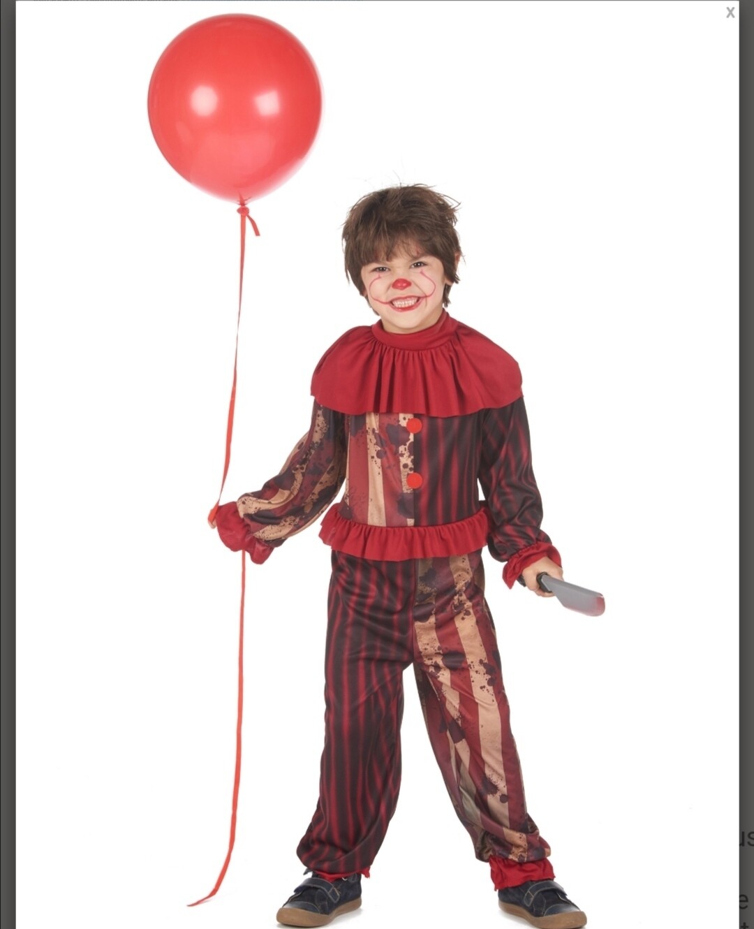 La combinaison est rouge avec des rayures.Elle semble ensanglantée grâce aux plusieurs tâche de sang.Elle est décorée de différent froufrous rouge au niveau de la taille ainsi qu’au niveau des poignets et des chevilles.Les manches sont larges et resserrée aux poignets .